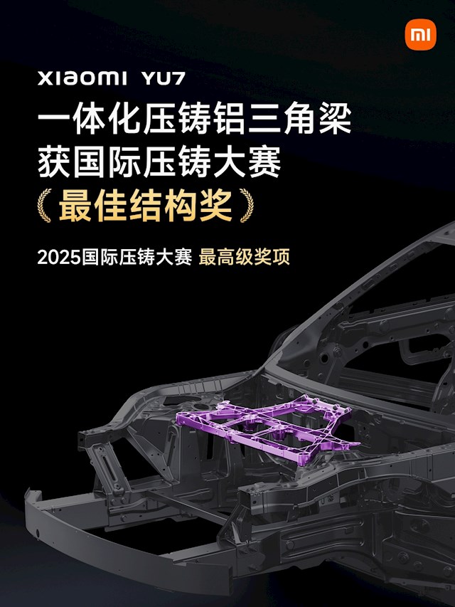 快科技11月13日消息,据小米汽车官方介绍,在北美压铸协会上,小米YU7 20合1一体化压铸铝三角梁获2025 International Die Casting Competition(2025国际压铸大赛)最佳结构奖,也是该大赛的最高级奖项。